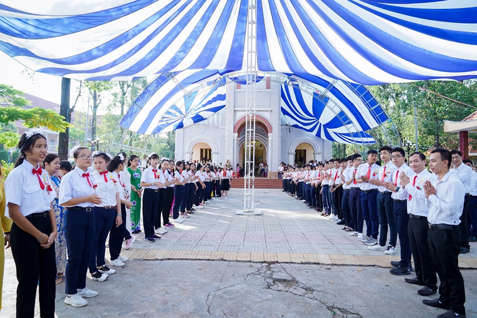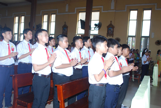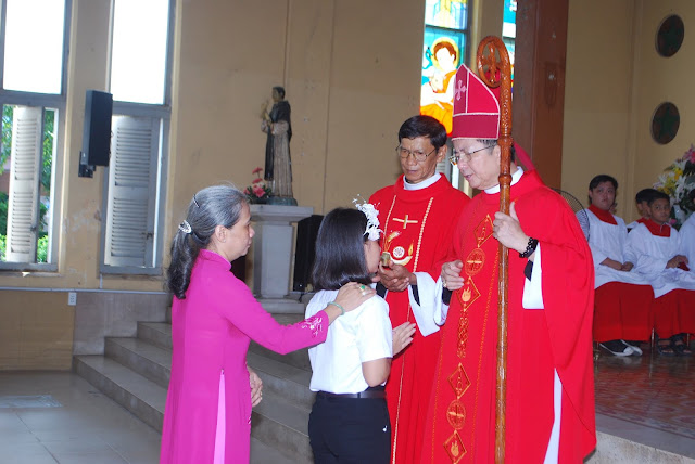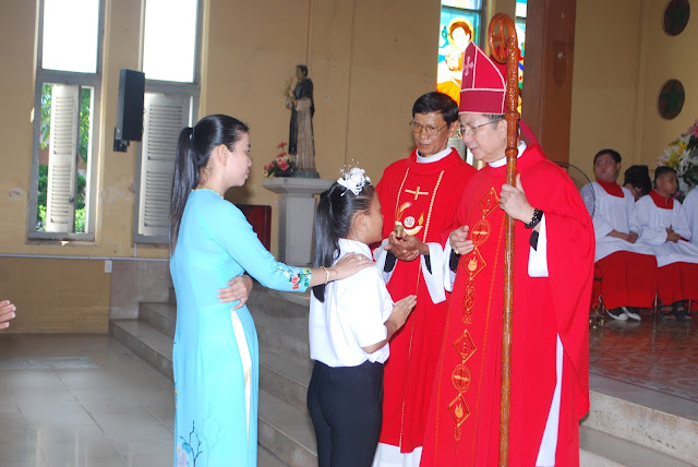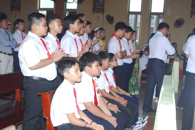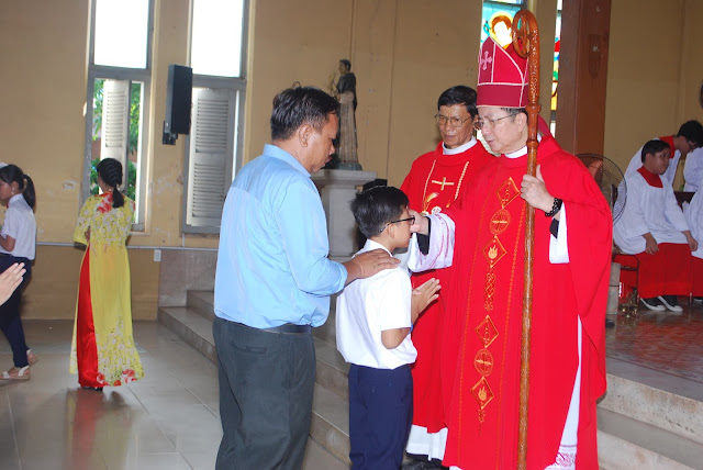 Sau phần Phụng vụ Lời Chúa, cha sở Simon trình lên Đức cha Giuse 64 em Thiếu nhi học giáo lý chăm ngoan, xứng đáng lãnh nhận Bí tích Thêm sức. Cộng đoàn cùng các em tuyên xưng niềm tin. Theo thứ tự các em tiến lên cùng người đỡ đầu. Đức cha Giuse xức dầu thánh, ghi hình Thánh giá trên trán, đóng ấn tín Chúa Thánh Thần, suốt đời các em nguyện trở thành men, muối, Loan báo Tin Mừng Nước Chúa trên bước đường mai sau.