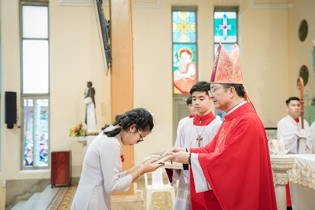 Qua đoạn Tin Mừng theo thánh Luca: “Thánh Thần Chúa ngự trên tôi, vì Ngài xức dầu cho tôi, sai tôi đi rao giảng Tin Mừng cho người nghèo khó..." Đức cha Giuse nhắc nhở cộng đoàn dân Chúa: Lời Chúa dành cho hết mọi người, nhất là những người tham dự thánh lễ hôm nay. Thiên Chúa tái tạo một quả tim mới, vì phạm tội đã trở nên chai đá và qua thử thách gian truân hãy sống xứng đáng với ơn gọi Chúa gửi đến trong sự khiêm tốn, hiền hòa. Không những các em Thêm Sức và Bao Đồng hôm nay mà mỗi người chúng ta cầu nguyện xin ơn Thánh Thần đến sửa lại mọi sự để chúng ta giống hình ảnh Chúa ngày một hơn.