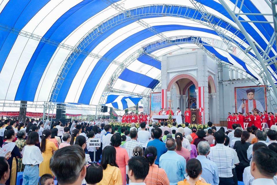 Tiểu sử cha thánh được lời Đức cha Phêrô hùng hồn ghi trọn cuộc đời, để mọi người luôn nhớ rằng cha thánh vốn sinh trong gia đình quyền quí, nhưng thánh nhân từ nhỏ đã có lòng ao ước được phúc tử đạo. Lòng đạo đức của cha mẹ ảnh hưởng rất lớn trong thời niên thiếu, và ngài là người đồng hương của chúng ta, gần gũi và thân thương biết bao! Chúng ta có một vị hiển thánh, là linh mục tiên khởi của giáo phận Phú Cường, vinh dự thay cho giáo xứ Búng nơi sinh ra, nuôi dưỡng cha thánh lớn lên trong niềm tin kính Thiên Chúa Ba ngôi chí thánh. Thánh! Thánh! Thánh! Đấng ba lần thánh chúng ta tôn thờ.