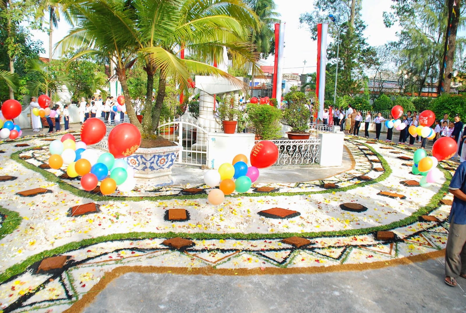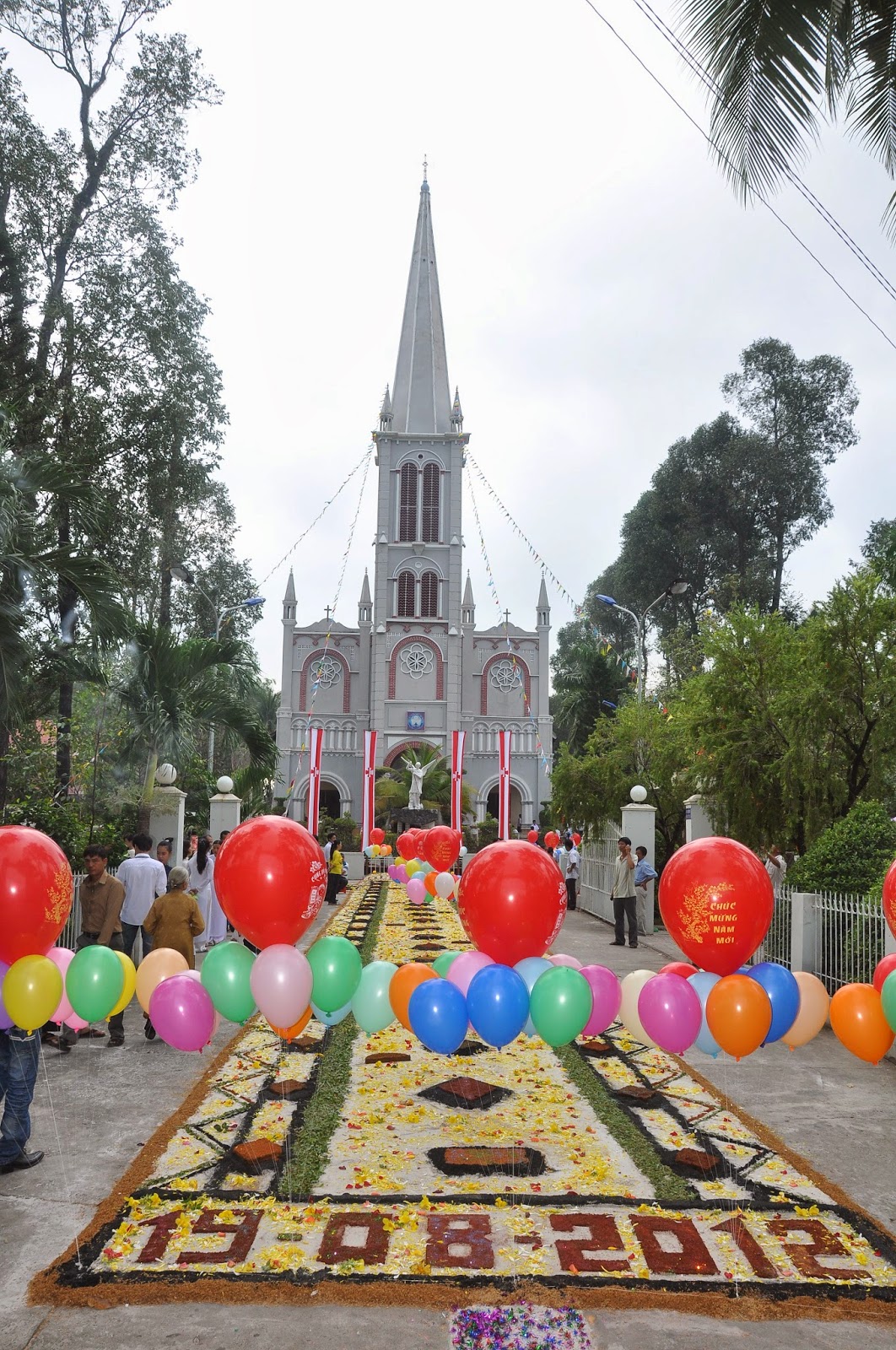 nay nhà thờ Búng được trang trí rất đẹp với cờ phướn, thảm hoa trải dài